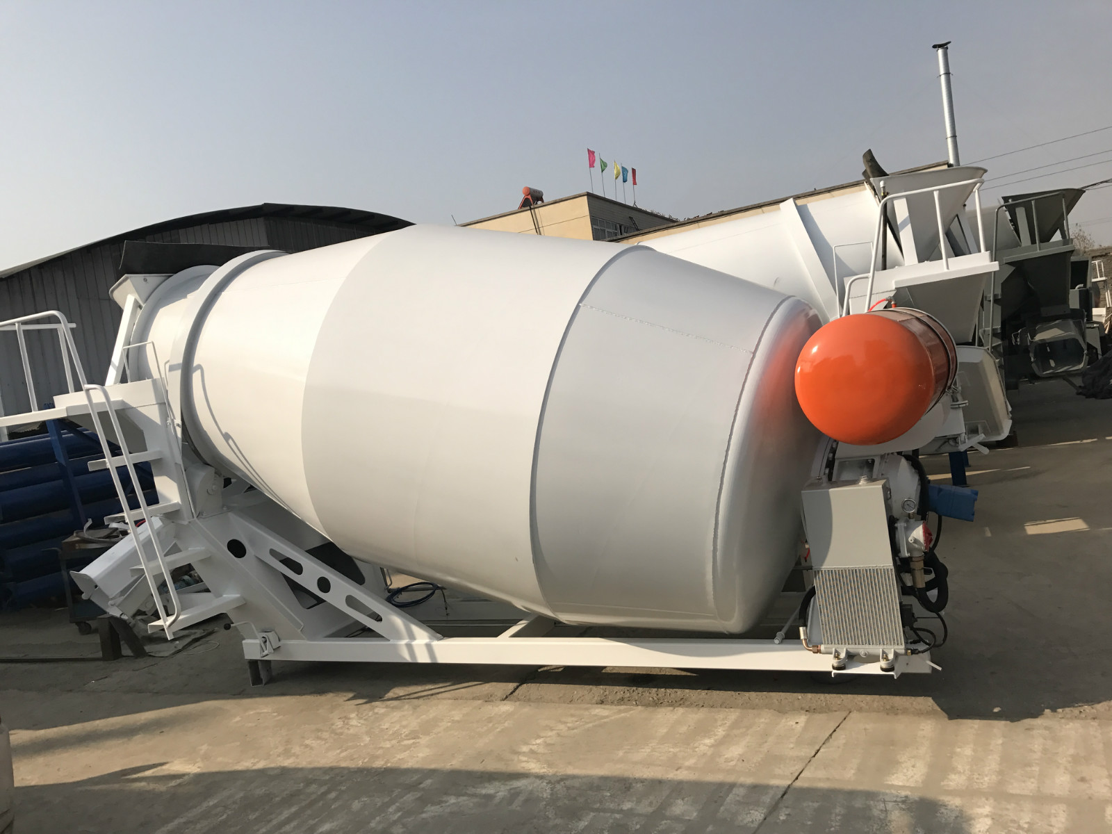 该混凝土搅拌机运输车搅拌筒和4.T自卸车底盘用2骑马螺栓及垫铁将其牢固连接在一起,组成混凝土运输车。主要作用是将搅拌好的混凝土迅速及时的运送到目的地,也可作为搅拌筒使用。